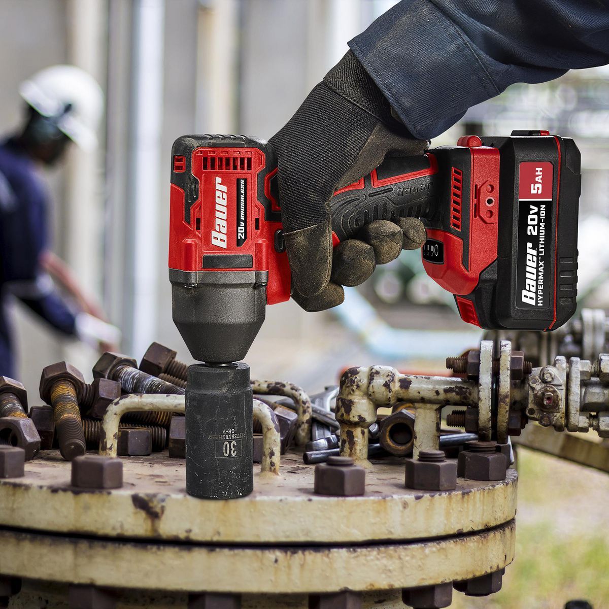 The BAUER 20V Brushless Cordless 1/2 in. 3-Speed Impact Wrench is designed for versatility and access in tight spaces. The high performance motor produces 300 ft-lbs of max torque for removing lug nuts and head bolts with ease. This impact wrench works with the BAUER™ lithium battery system for fast charging and longer runtime.