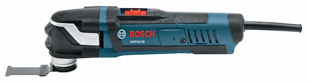 The Bosch GOP40-30B StarlockPlus®® Oscillating Multi-Tool Kit includes a tool that has the Starlock® next-generation 3-D tool-accessory interface, which produces best-in-class accessory grip, making it the new professional standard in oscillating tool performance. With more contact surface area between the tool and accessory, the Starlock® interface is a cupped 3-D tool-accessory connection that delivers greater torque transfer for an expanded work capacity. The no-touch blade-change system makes it easy to attach, remove or reposition blades. The professional-grade 4.0 Amp motor delivers a top speed of up to 20,000 oscillations per minute, and the tool provides a 3.0° oscillating arc. A variable-speed dial allows the user to set the optimal speed for the task at hand, and Constant Response circuitry maintains the desired speed under load This robustly constructed tool has reinforced gearing for more durability, less vibration and optimal force transmission. At only 3.3 Lbs., this light and compact tool reaches tight spaces, provides comfortable ergonomic grip zones and has an LED light for illumination in dark work areas. It is ideal for flush cuts such as door-jamb cuts (using various plunge or segment blades). The GOP40-30 provides outstanding versatility – utilizing the many Starlock® and StarlockPlus®® accessories to handle flush-cutting, plunge-cutting, sanding, grinding and many other tasks related to a wide array of materials. For compatibility with StarlockMax®® accessories, which perform industrial-grade applications, Bosch offers the GOP55-36 Oscillating Multi-Tool.