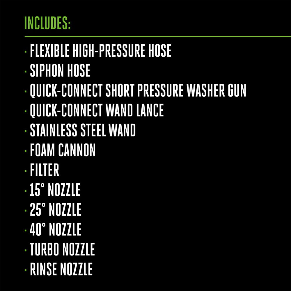 - Includes flexible 25-foot high-pressure hose, siphon hose with filter, quick-connect short pressure washer gun, stainless steel wand, and foam cannon