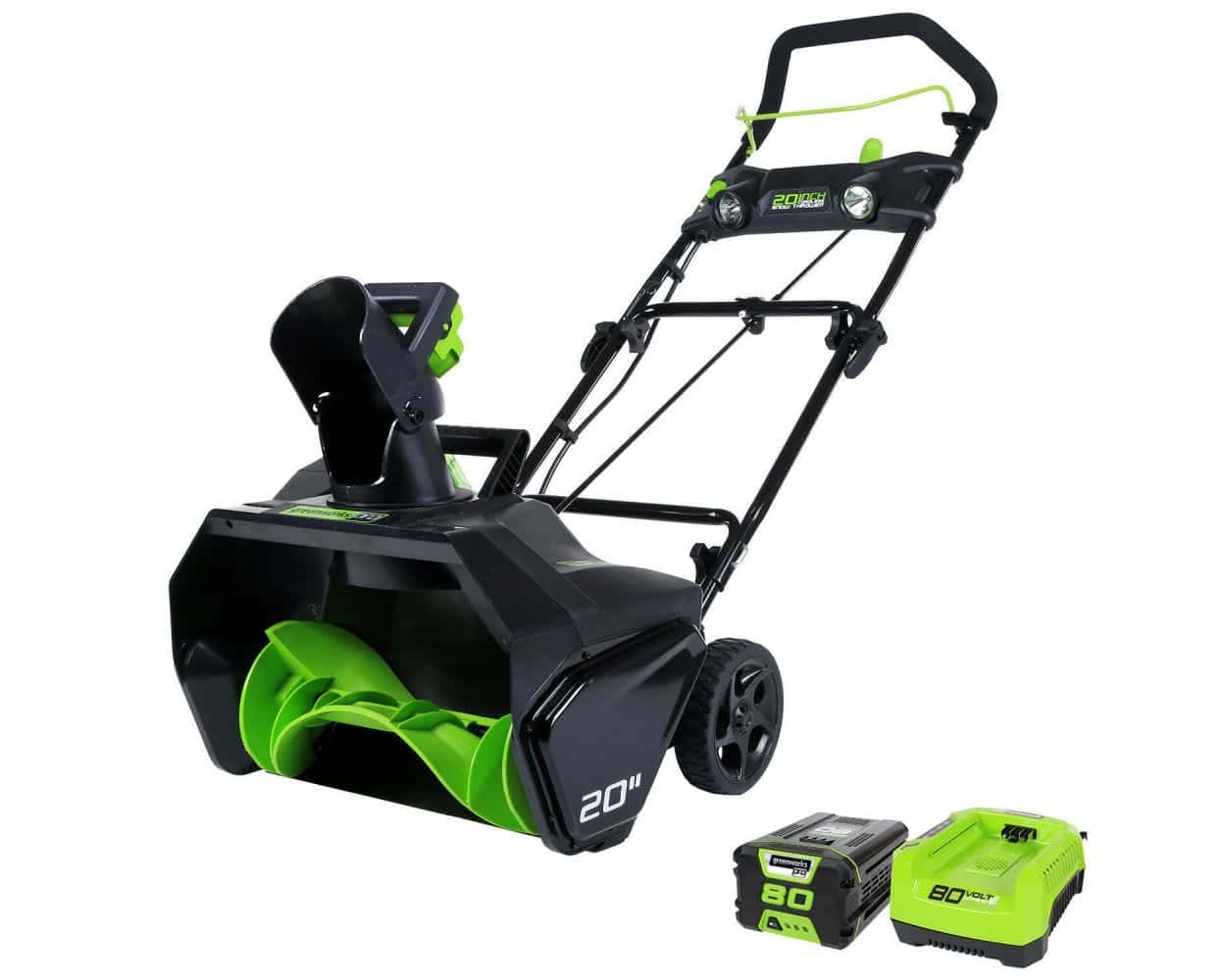 - Greenworks Pro 80-volt 20-in cordless electric snow blower provides up to 45 minute runtime on a fully charged 2.0 Ah battery (battery and charger included)