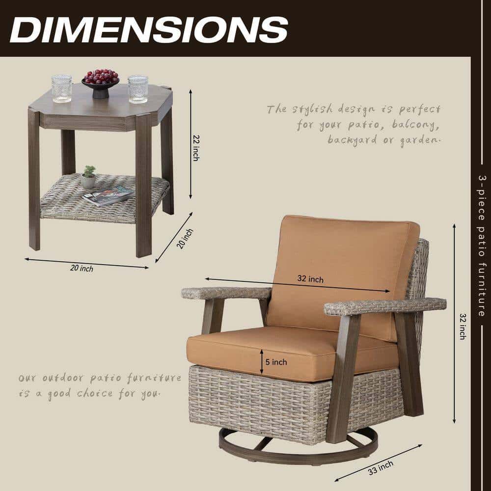 JOYSIDE 3-Piece Wicker Patio Swivel Rocking Chair Conversation Set with Tan Cushions