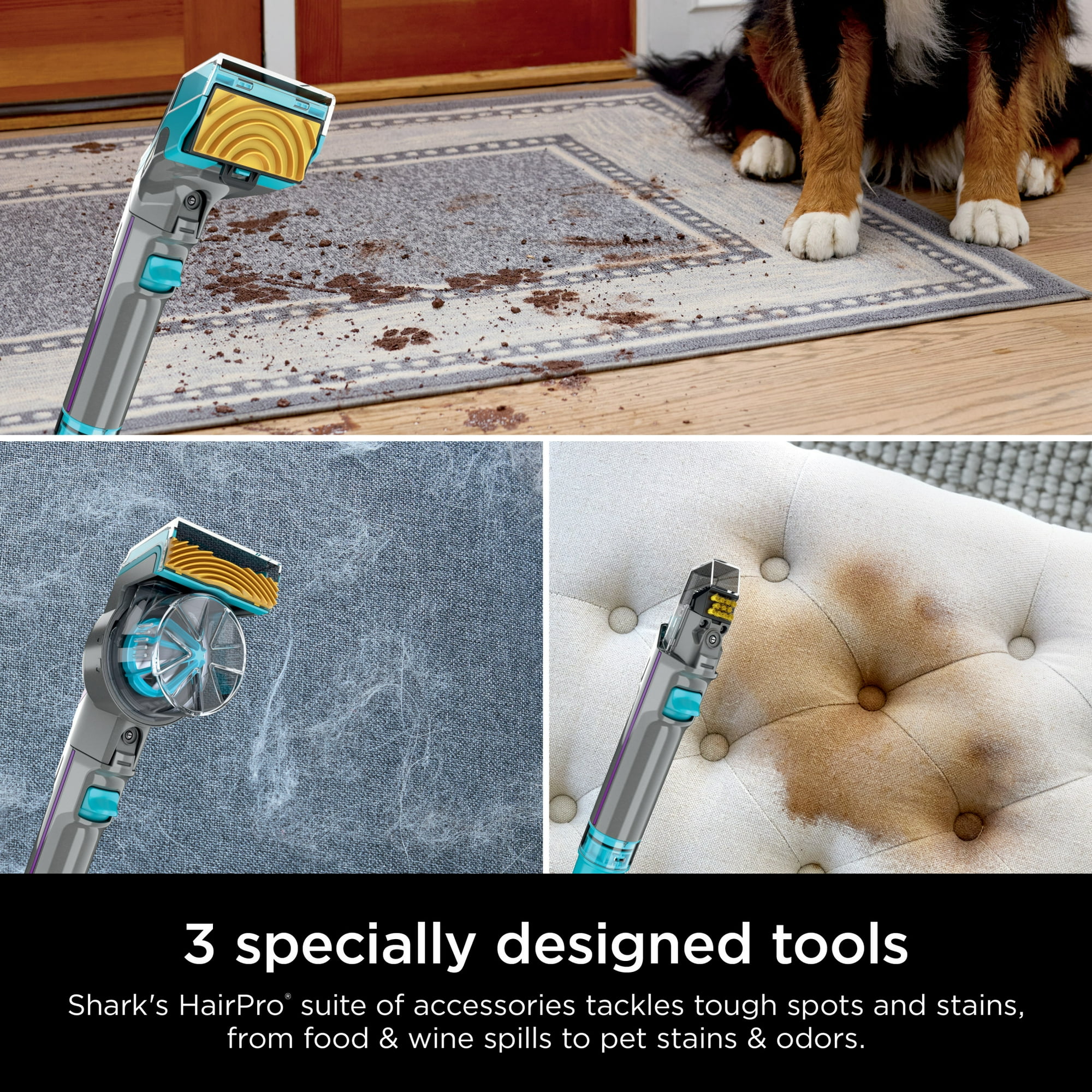 The Shark CarpetXpert HairPro with StainStriker, 2-in-1 upright deep carpet cleaner with built-in spot and stain eliminator delivers unbeatable deep carpet cleaning*, unbeatable tough stain elimination** and Shark’s deep-cleaning HairPro innovation is designed to pull up deeply embedded hair from carpet fibers with no clogs, no clumps, and no hair wrap. By combining the action of Shark’s powerful suction, high-speed brushroll, and high-pressure spray, it delivers unbeatable dirt & grime removal* and delivers 3X more pet hair pickup‡* than any competitor on the market. Tackle the toughest household and pet stains on carpets, area rugs, upholstery, auto interior, and more with the built-in spot & stain eliminator, mixing two unique chemicals to deliver 20x more stain-striking power^ and instant odor removal – even smoke and pet urine.^*