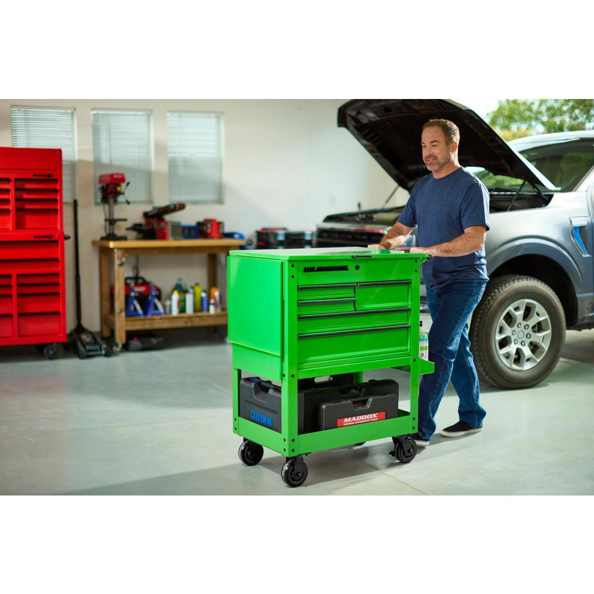 - 5 drawers and 1 side can-holder for easy organization of hand tools, power tools, and more