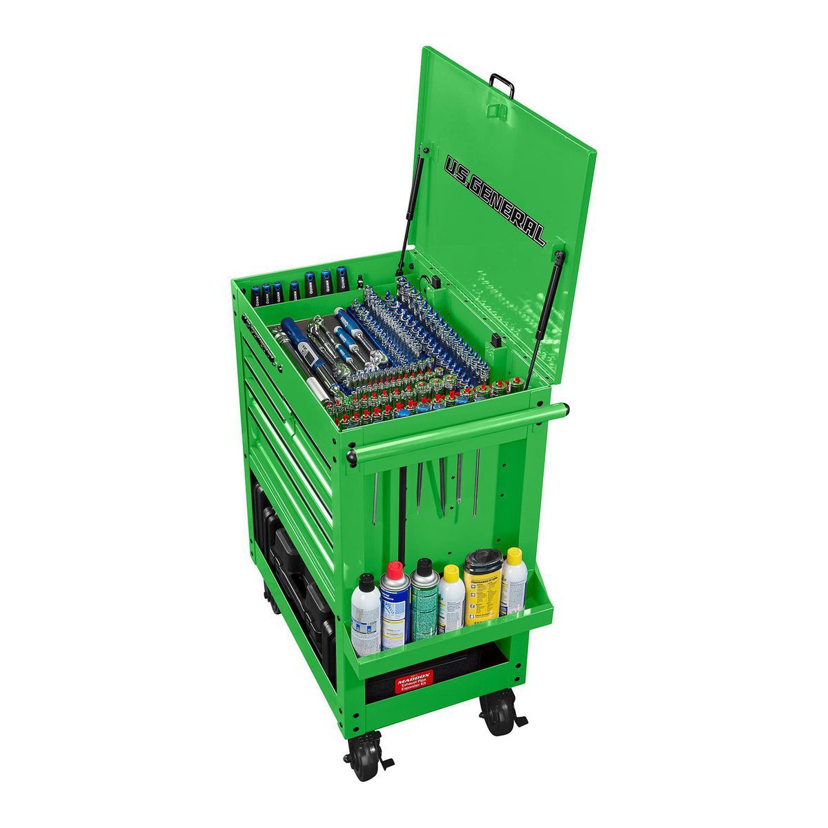The U.S. GENERAL Mechanics Cart is equipped with a 5-drawer setup optimized for tool storage. The cart has 15,000 cu. in. of total overall storage, 6900 cu. in. of lockable storage, and a 700 lb. load capacity. With rolled drawer edges, full-width drawer latches, precut nonslip drawer liners, a side can-holder, and an integrated power port, this mechanics cart is loaded with the features you need, including an integrated barrel lock to secure all the drawers. Durable full-extension ball-bearing slides and a tough powder-coated finish mean this cart is up to the task at hand whether it’s in the local automotive shop or in your own garage. The U.S. GENERAL cart line is designed internally by our Harbor Freight engineering team to precise industry-leading standards, and every specification and feature is rigorously tested in our state-of-the-art testing facility in the USA. The combination of quality materials, precise standards, and rigorous testing provides you with peace of mind knowing this cart is high quality and is resilient for a long service life.